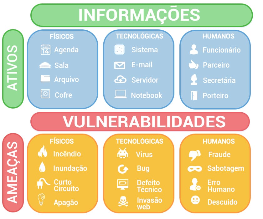 O quadro acima é apenas um exemplo, um panorama. Isto posto, vamos trabalhar com base em seus ativos e nas ameaças que envolvem cada grupo.