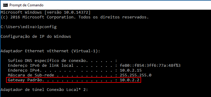 2. No Prompt de Comando, digite o "ipconfig" e dê enter. Nas informações fornecidas, o endereço IP do roteador não estará no item “Gateway Padrão”.