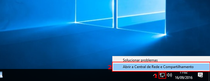 - Clique com o botão direito do mouse no ícone da conexão de rede do Windows. Nenhum menu que aparece, clique na opção “Abrir a Central de Rede e Compartilhamento”.
