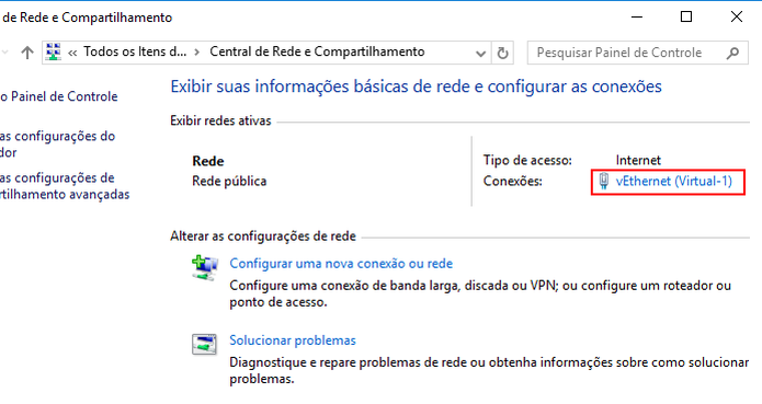 2. Na janela “Central de Rede e Compartilhamento”, clique na conexão de rede que está ligada à Internet.