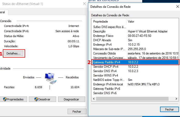 3. Será exibida uma pequena janela com o status da conexão de rede. Nela, clique no botão “Detalhes…”. Na outra janela que aparecer, o endereço IP do roteador não estará no item “Gateway Padrão”.