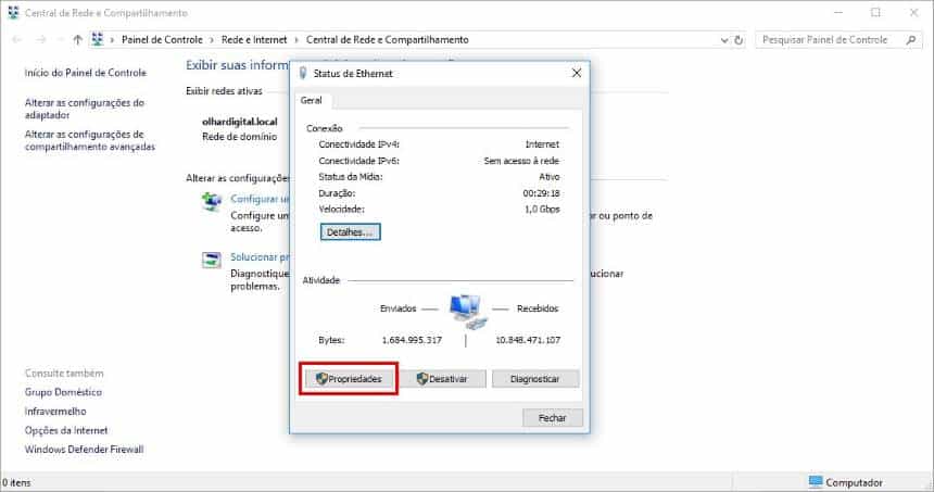 2. Na janela de “Central de rede e compartilhamento”, clique no nome de sua conexão;