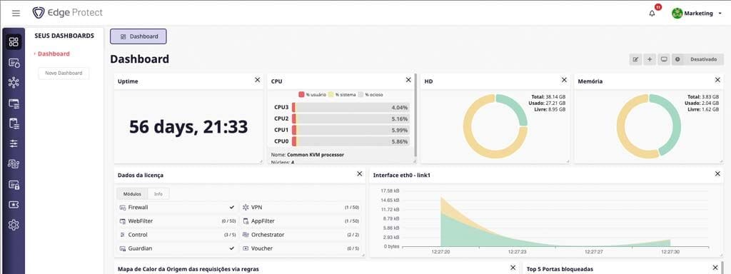 Já o Edge Protect oferece a interface mais intuitiva, facilitando o gerenciamento. Ele permite o controle de aplicativos por AppFilter, filtragem web dinâmica com categorização de 70+ categorias via WebFilter e integração com autenticação via Captive Portal (LDAP, Radius, Oauth).
