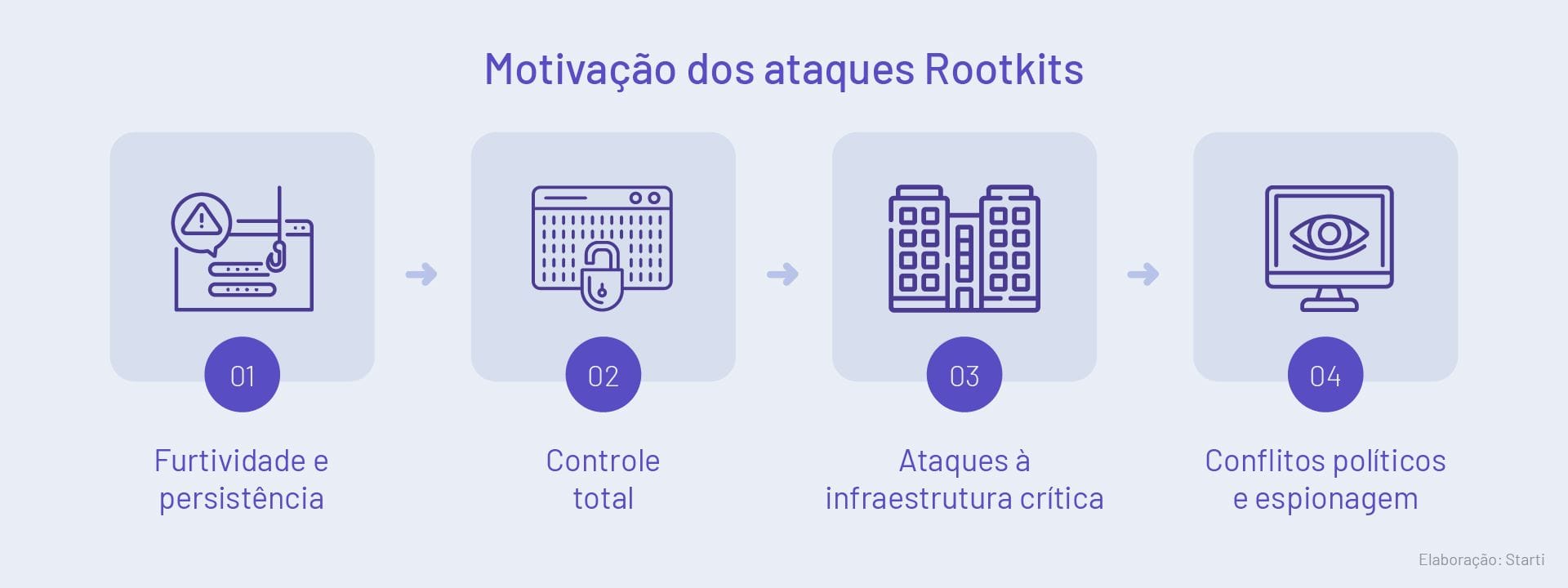 - Ataques à infraestrutura crítica: os rootkits podem ser utilizados para atacar infraestruturas críticas, como sistemas de energia, água, saúde e serviços financeiros. Isso ocorre pela dificuldade de detecção e mitigação desses malwares.
