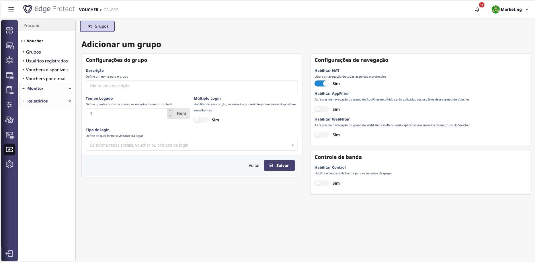 - Habilitar WebFilter: as regras de navegação do grupo WebFilter escolhido serão aplicadas aos usuários desse grupo do Voucher.