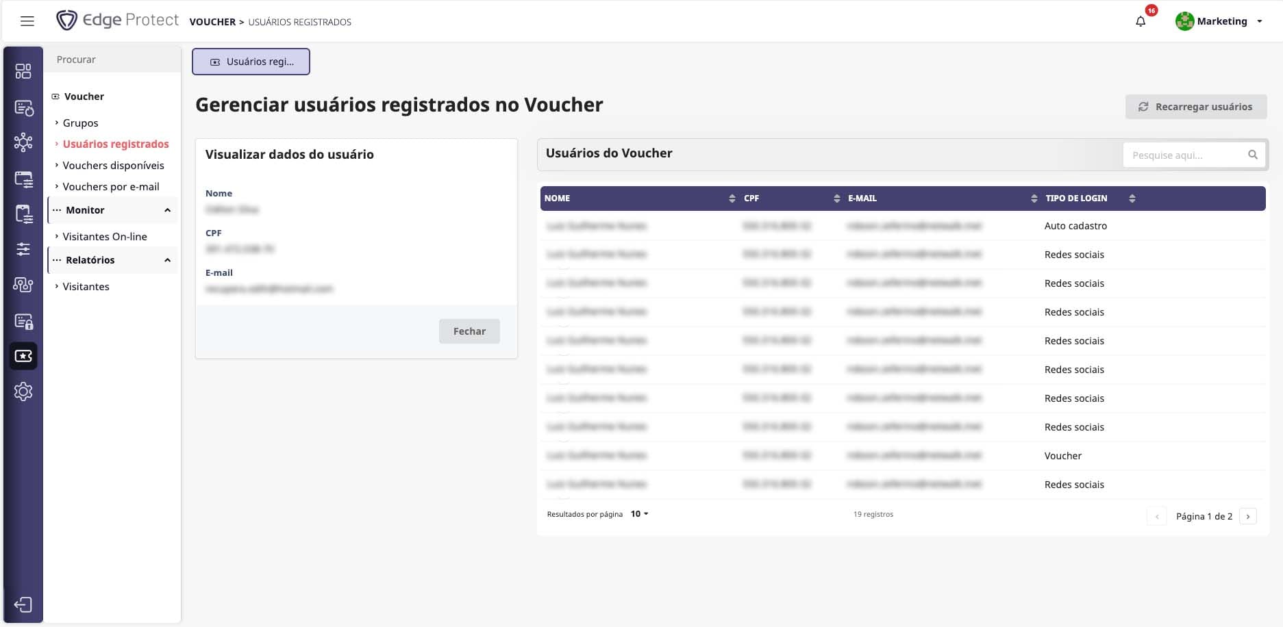 Após ajustar essas configurações você pode acompanhar os usuários registrados no Voucher, seus dados como o nome, CPF, e-mail e o tipo de login. Esse gerenciamento facilita o fluxo de acompanhamento na proteção da privacidade das informações.