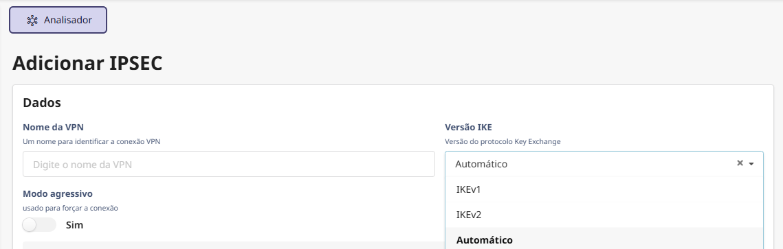 Escolha a versão do IKE (1 ou 2). A versão 2 é recomendada se compatível com ambos os lados por ser mais atualizada e segura.