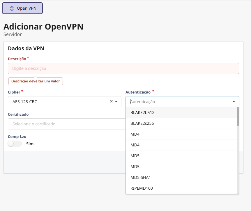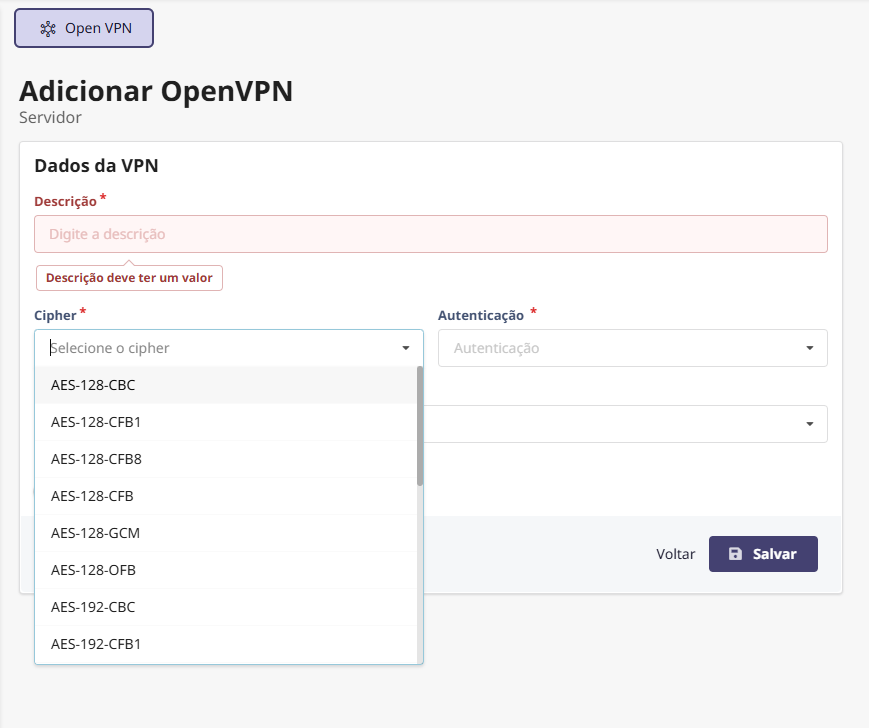 Clique no campo “Cipher” e escolha um método de criptografia (cipher) que será utilizado para cifrar e decifrar os pacotes transmitidos pela VPN.