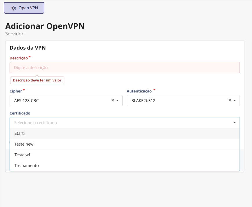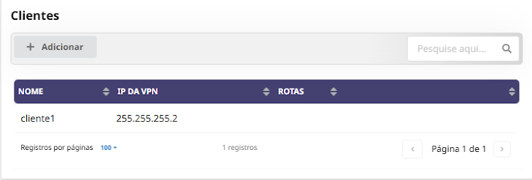 Dentro do módulo VPN, selecione a opção "OpenVPN", então clique em “Adicionar” para iniciar a configuração de um novo servidor OpenVPN.