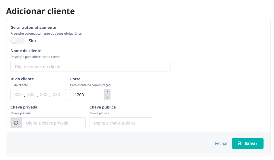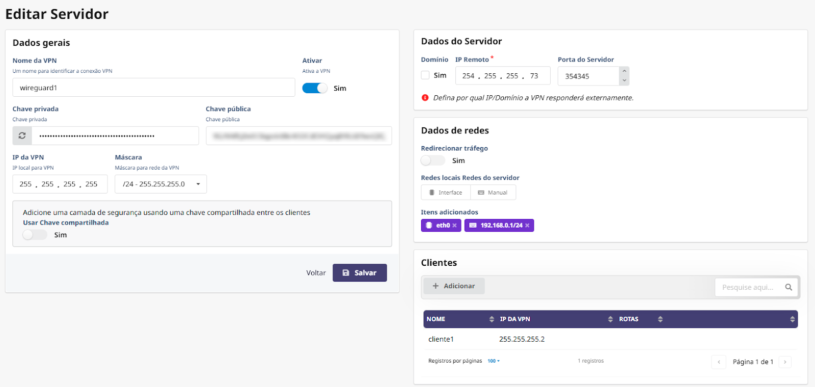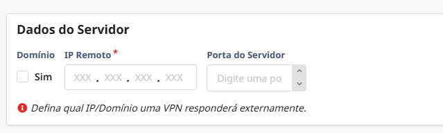 7. Dados do servidor: insira o IP público ou DDNS que os clientes usarão para se conectar. Se necessário, utilize o DDNS para uma configuração mais dinâmica.