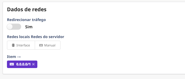 9. Dados de redes: esse campo define o que você irá compartilhar com o cliente, você pode inserir o IP de um servidor específico. Use Redes locais quando o cliente/filial precisar acessar recursos internos da LAN, e use Redes do servidor quando o acesso for apenas ao túnel/VPN e ao próprio firewall.